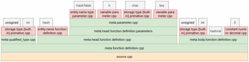 每一个 token 都像在一个栈上。事实上,这个结构和 “作用域栈” (Scope Stack) 非常像:从左向右读取 token 流,每进入一个 “作用域”,则压元素入栈;每离开一个作用域,就弹出该作用域的元素。例如,读取 HashTable 记号,进入参数列表的作用域,压 “meta.head.function.definition.parameters” 入栈;读取函数体内的第一个 unsigned,离开参数列表的作用域,弹出该元素。